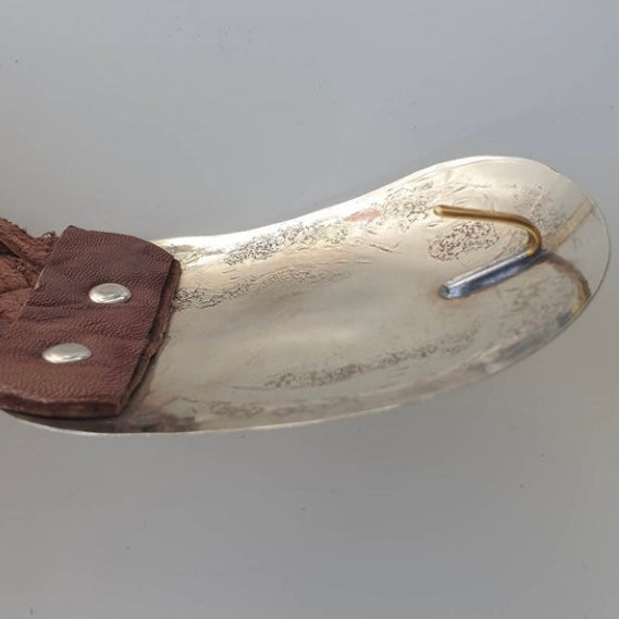 The vintage buckle is silvery/gold (a soft silver with slightly gold hues / not a stark silver) and hand engraved. Variations in the colour of the stone are characteristic of the nature of the item and will differ in colour and is made to look weathered.